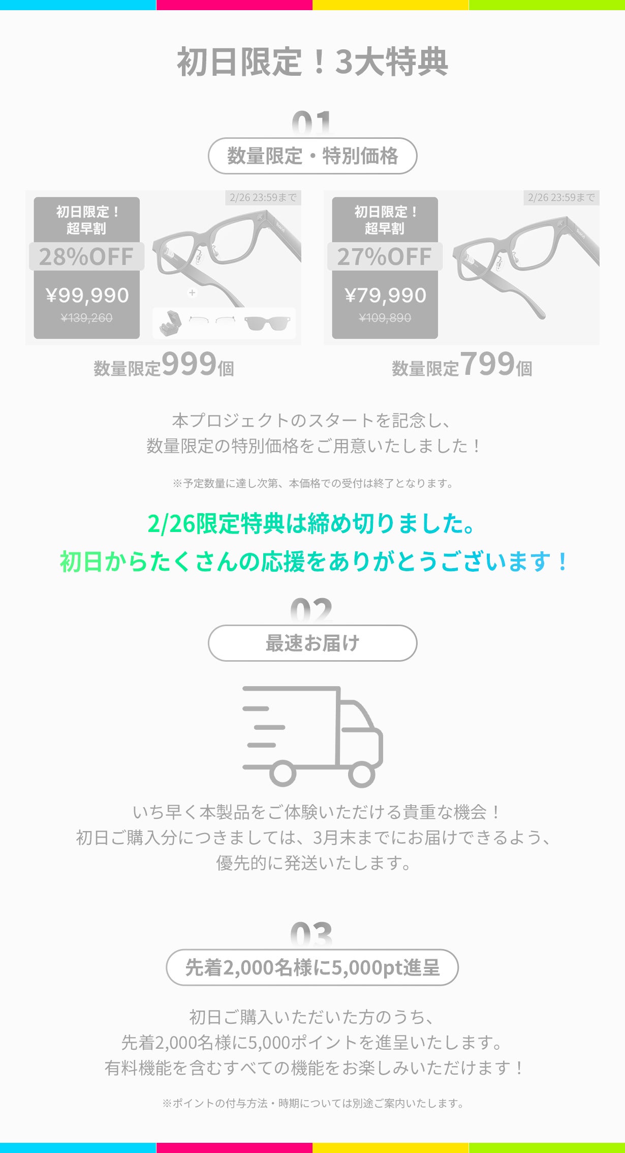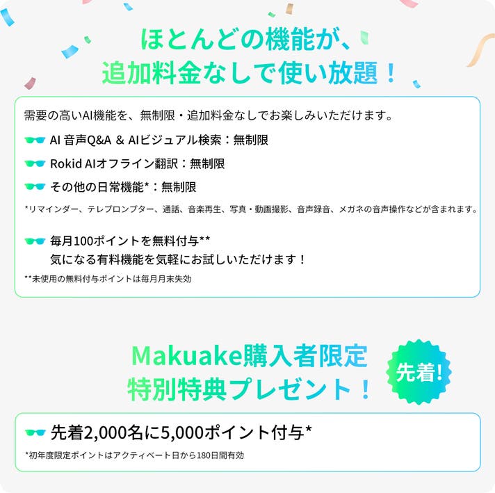 A. MakuakeにてスマートAIグラス本体を含むリターンをご購入いただいた方のうち、先着2,000名様に5,000ポイントをプレゼントいたします。