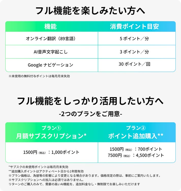 A. 一部の高度な機能(89言語オンライン翻訳、AI音声文字起こし、Googleナビゲーション)は、ポイントを消費して利用する仕組みとなっております。