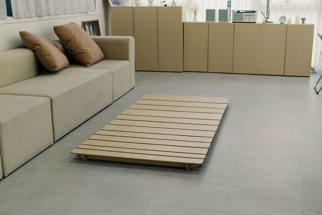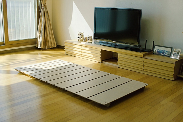 床や畳の上にそのままマットレスを置いたり、トッパーや布団を敷いて寝床として使うことも可能ですが、清潔さを考慮したり体重分散のためにはベッドフレームを使うのがお勧めです。ロールベッドを使用すると、寝具やマットレスを湿気やホコリから守ることができます。通気性を良くするため接着剤を使わず、組み立て式になっています。
