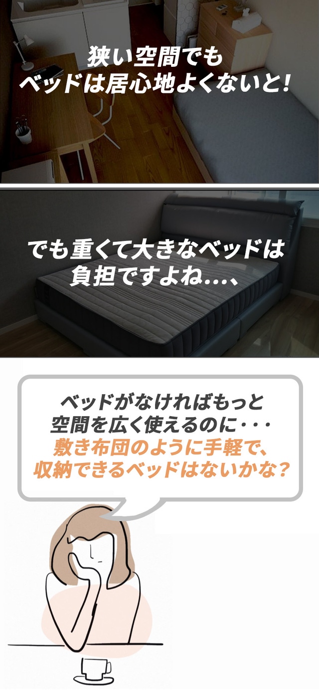 生活空間が狭いほど、ベッドが占めるスペースがもったいないとお悩みの方は、ベッドを巻いて収納してしませんか?『ロールベッド』はくるくる巻くだけで、コンパクトなサイズに大変身します!