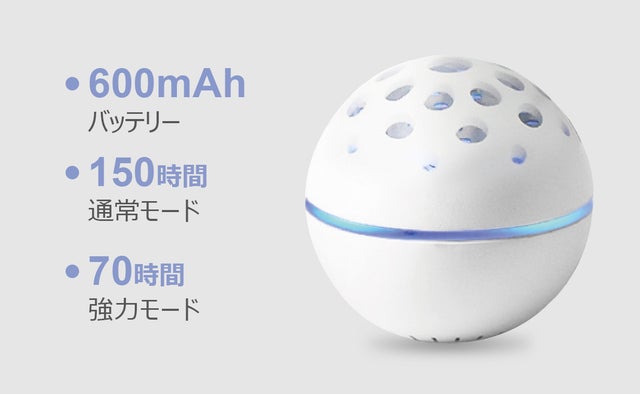 長時間使用できる600mAh大容量バッテリーを搭載し、電源のない場所でも使用できます。一回のフル充電(約3時間)では約150時間(通常モード)連続使用できます。