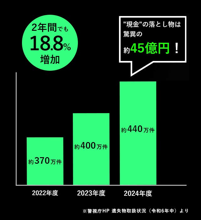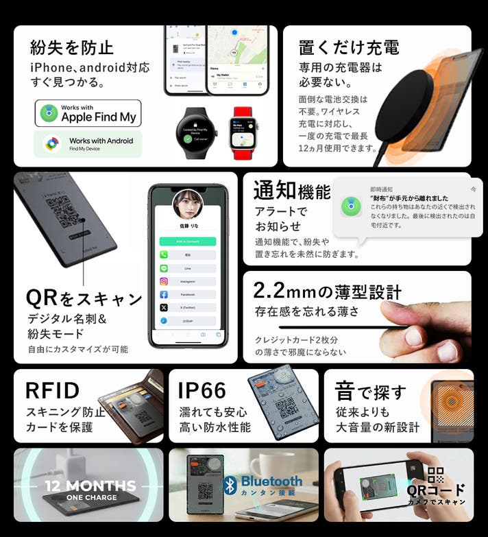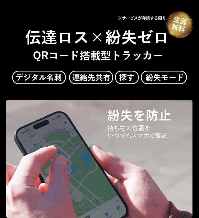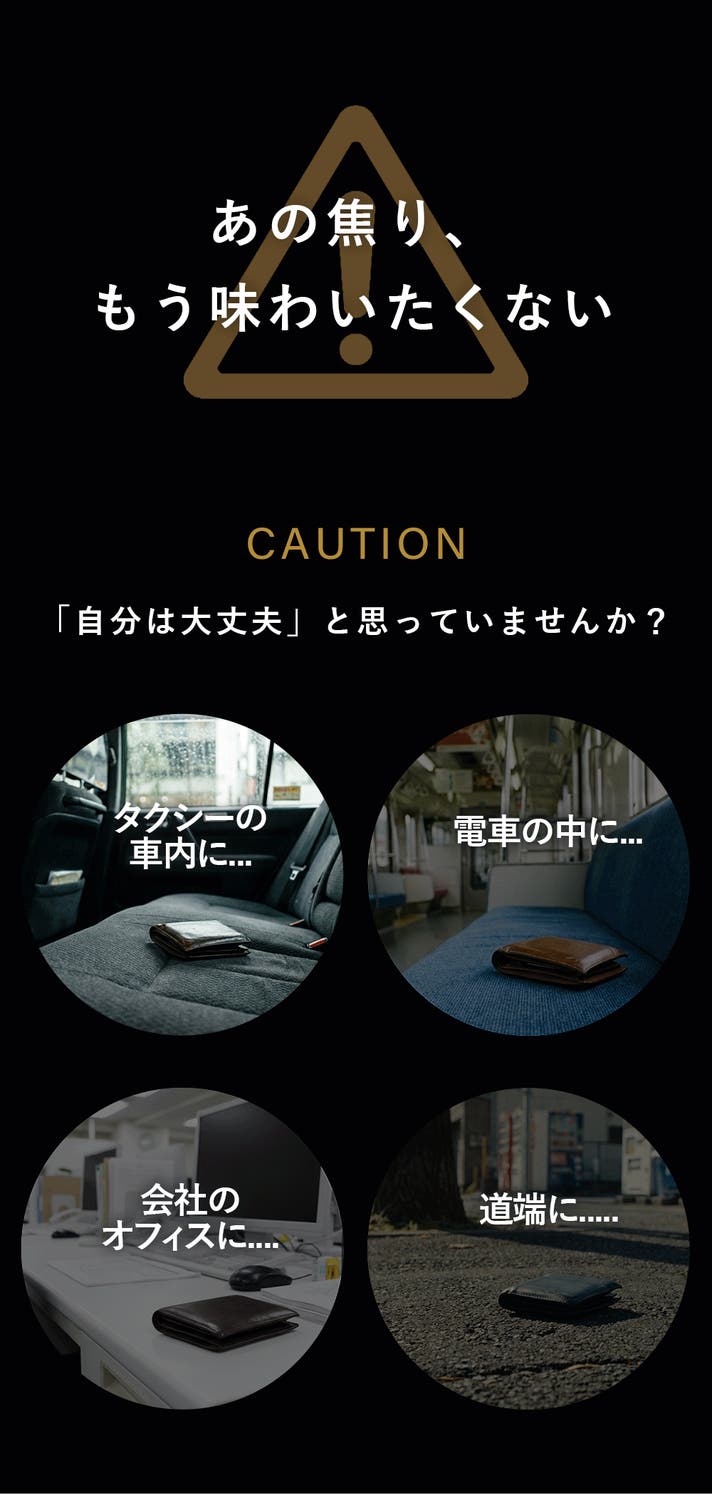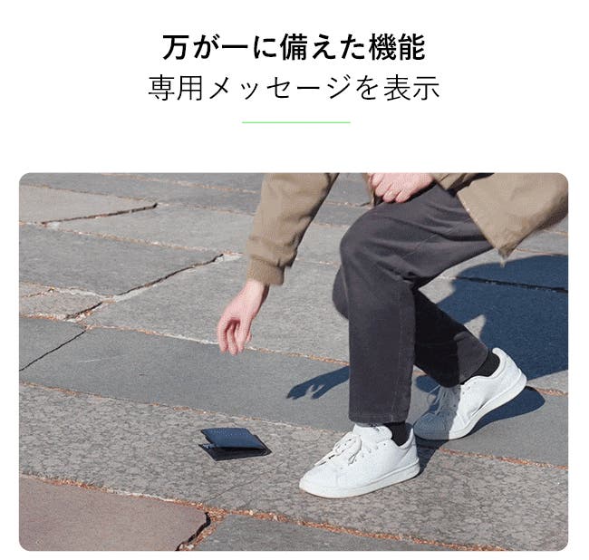 財布はもちろん、一見すると重要そうに見えない持ち物でも、「これは大切なものです。ご連絡ください!」という想いをしっかり伝えられる。従来のトラッカーとの違いは、見つけるだけでなく、相手にメッセージできること!だから、紛失しても戻ってくる可能性がぐっと高まります。