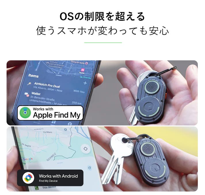 狭いポケットもバッグの奥も、もう迷わない!「Find Hub」やSiri・Googleに頼むだけで、AirNotch Pro Dualが瞬時に音を鳴らし、鍵をすぐ発見。パワフルサウンドでアイテムの位置を確実に特定!