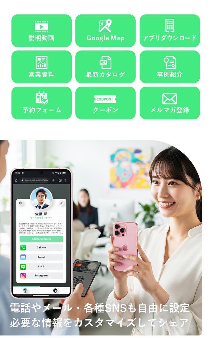 自己紹介だけじゃない。説明動画、Googleマップ、アプリダウンロード、営業資料、最新カタログ、事例紹介、予約フォーム、クーポン、メルマガ登録など、伝えたい情報を、これ一つにまとめて表示できます。リンクを探したり、説明を何度も繰り返したりする必要はありません。QRを読み取るだけで、相手は必要な情報へすぐにアクセス!