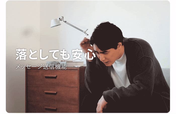 もしもの時も、ただ探すだけじゃない!万が一落としてしまっても、スマホから**「紛失モード」に切り替えるだけで、拾った人に向けた専用メッセージを表示**できます。