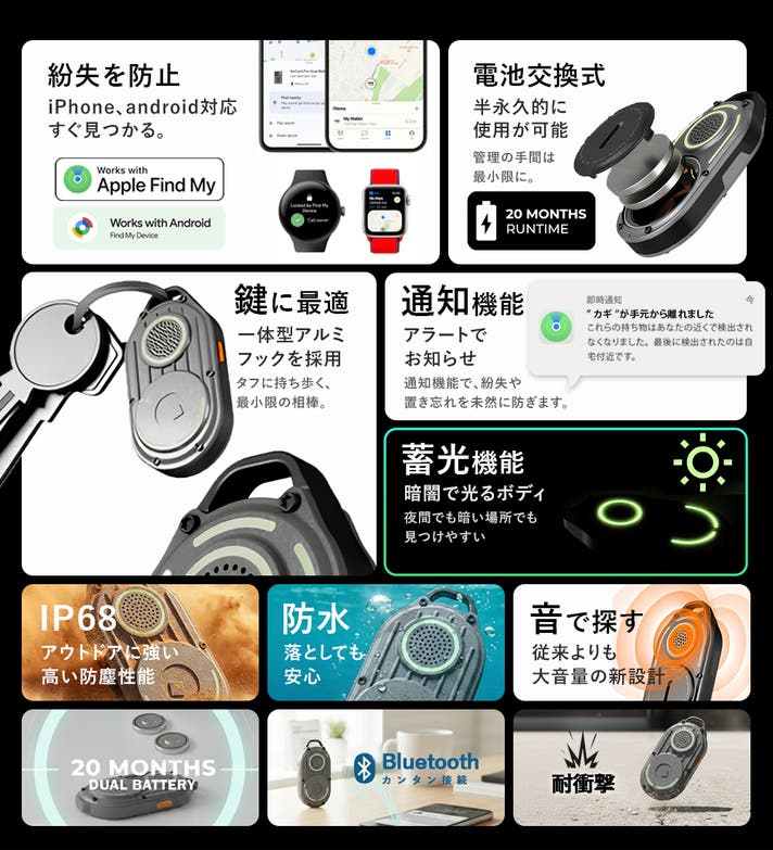 - 【防水防塵×360°大音量】全天候で鍵を守る。家でも旅行でもアウトドアでも迷子にしない