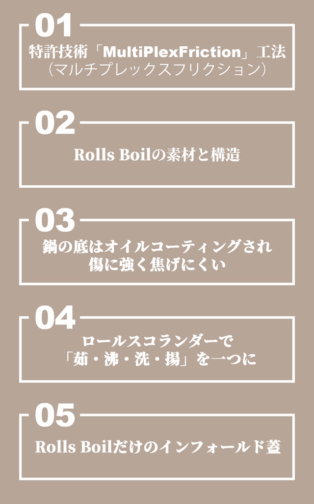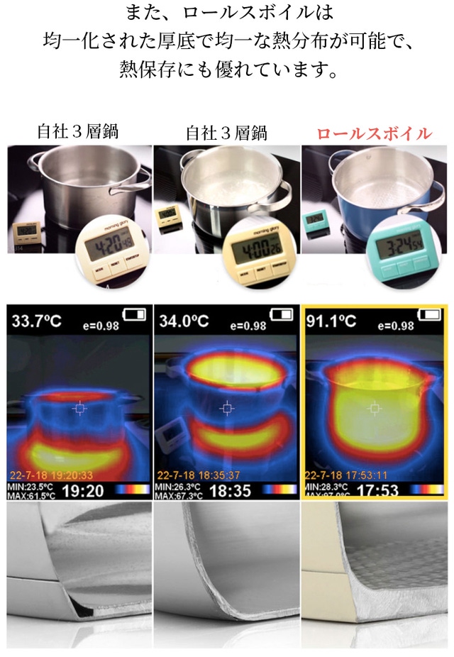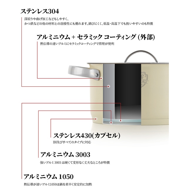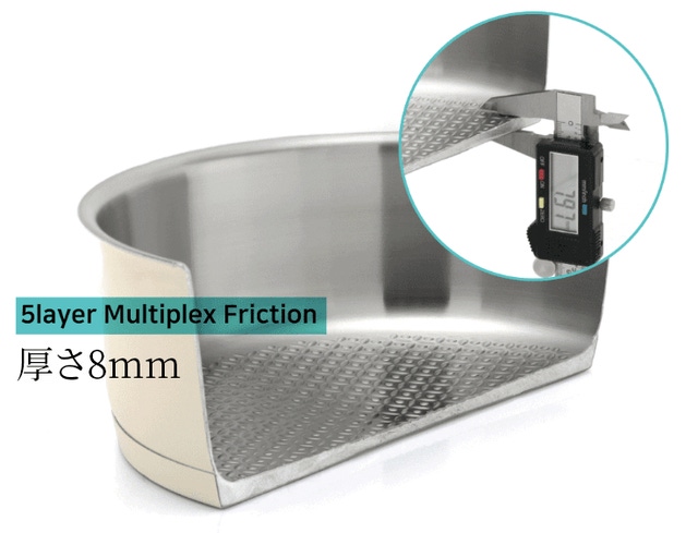 - 「熱しやすく冷めにくい」 素材の特徴を最大限に活かして設計した5層構造