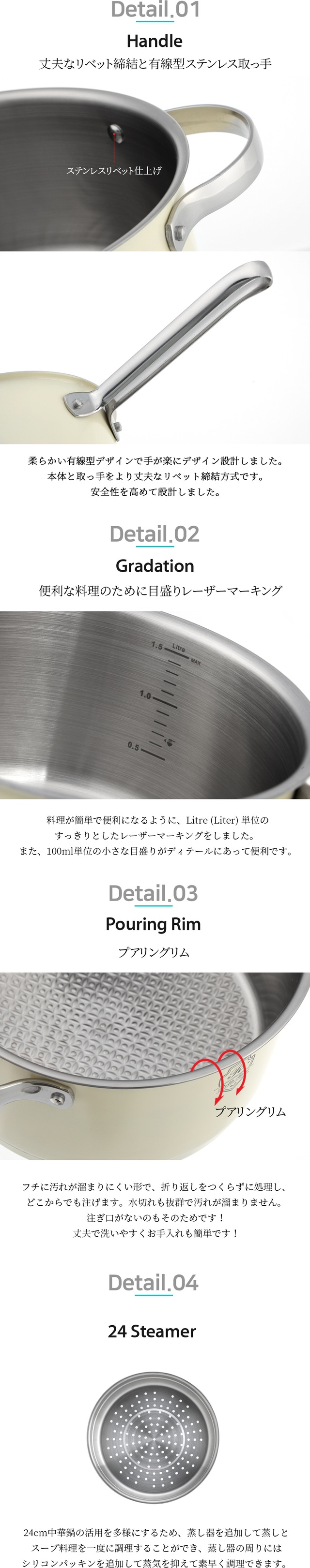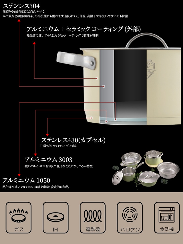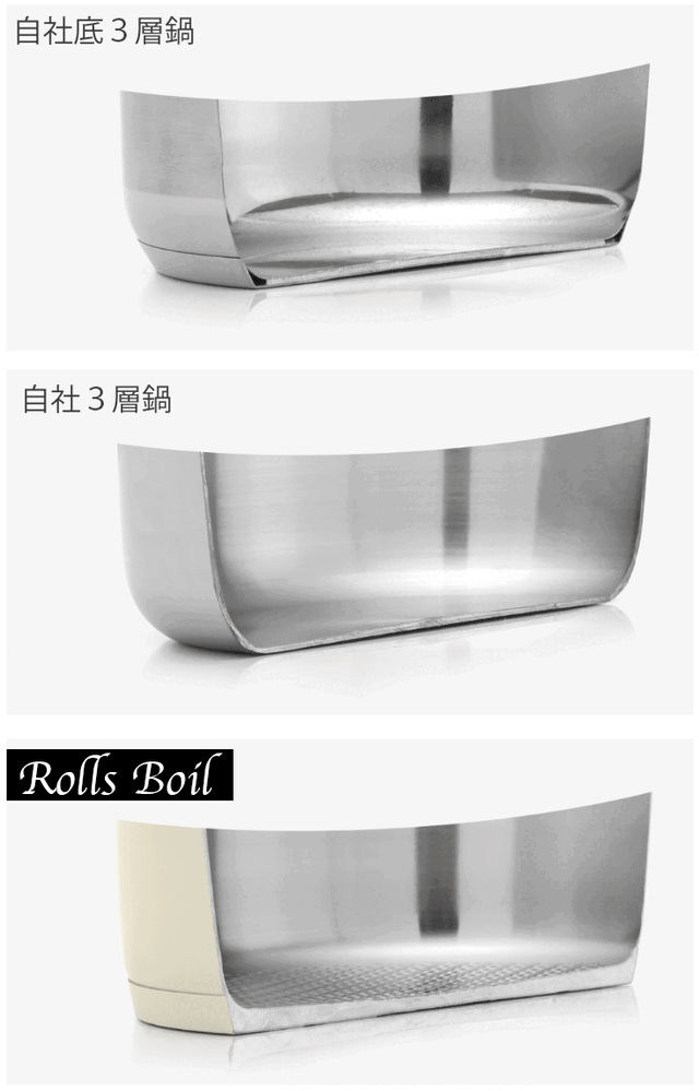 - マルチ熱源対応型、優れた熱伝導率で底にあたった熱が素早く側面にも伝わる。