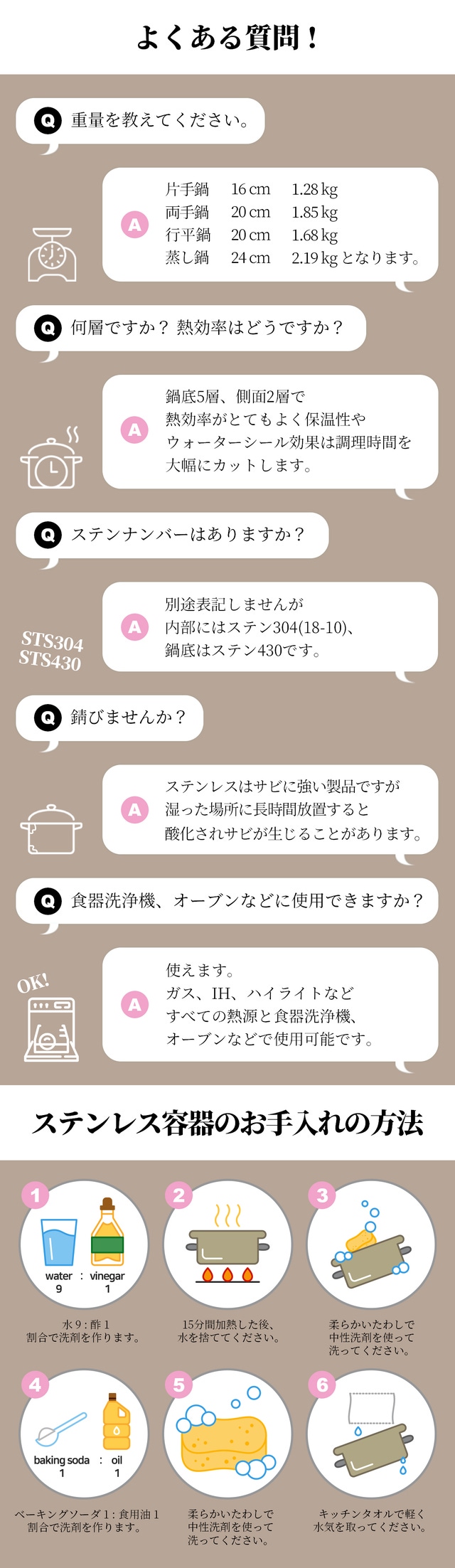 無駄のないデザインで、すみずみまできれいに洗えてメンテナンスが楽。底厚の5層構造で、素材のうまみを十分に活かしたおいしい料理がつくれる実力。あらゆる熱源に対応し、IH電磁調理器との相性も抜群、と、非の打ちどころのないお鍋なのです!