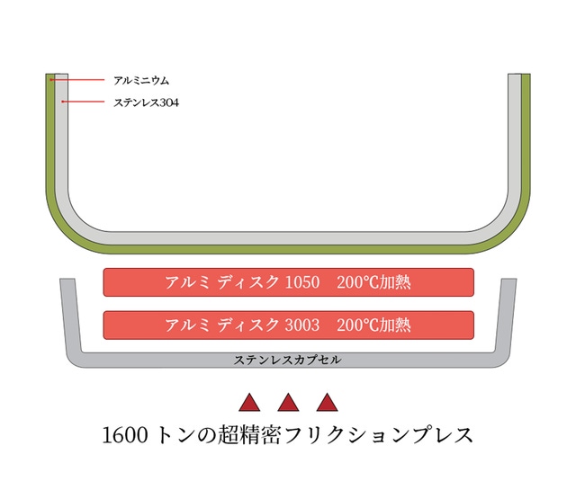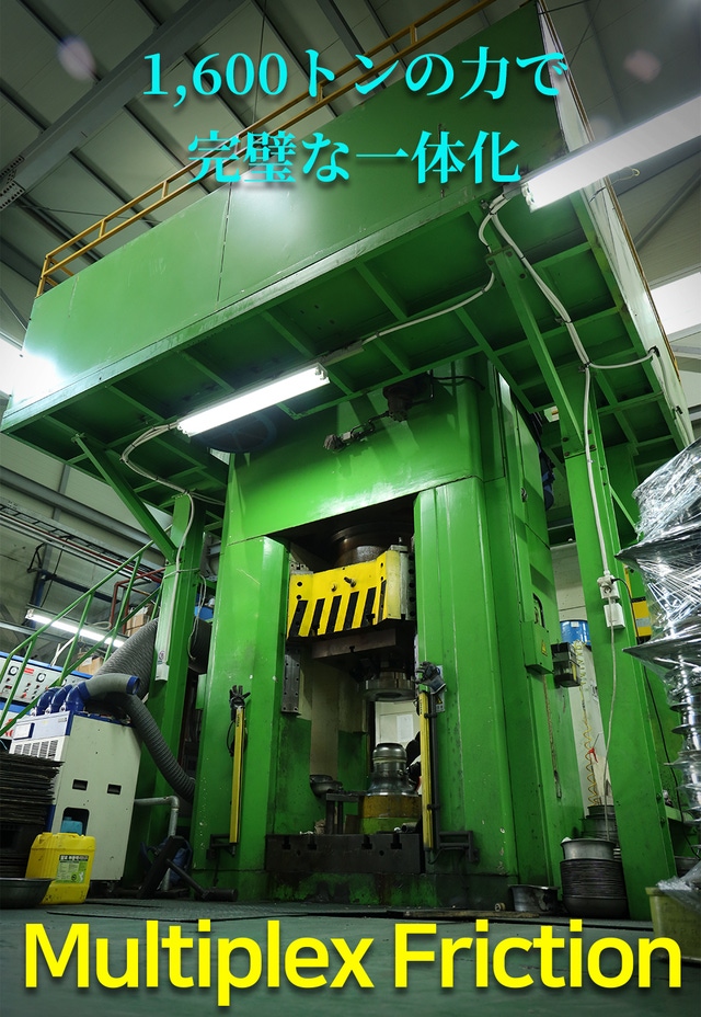 2枚のアルミディスクを順角に200度の高温で加熱し、1600トンの超精密フリクションプレスで完璧に床と体を一体化!