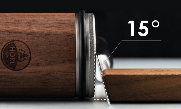 15度の角度には理由があります。欧米のナイフと日本の和包丁は、その歴史も素材も用途も違うけれど、実は、ほとんど全ての刃物は13-17度の角度で作られている、と開発者は言います。 故に、どんな刃も15度に固定して研ぐことが、安定的、且つ鋭い刃先を作るという目的を果たすために、最も合理的で、長い歴史で培った日本の研ぎの技術がそれを証明しています。