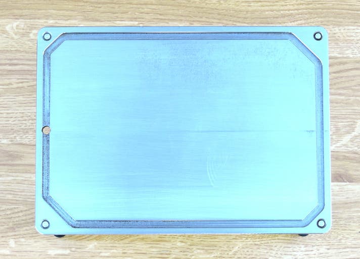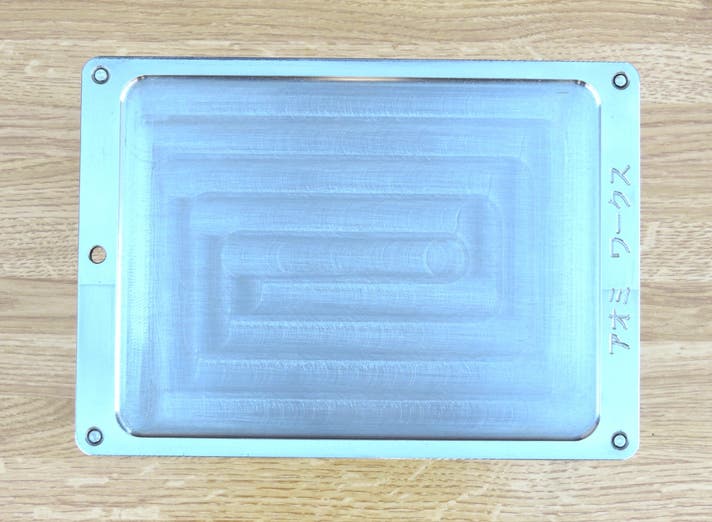 鉄板はただ切り出しただけの鋼材ではなく、マシニングという切削機械を使い、ミーリング加工で一枚ずつ全面削り出し。