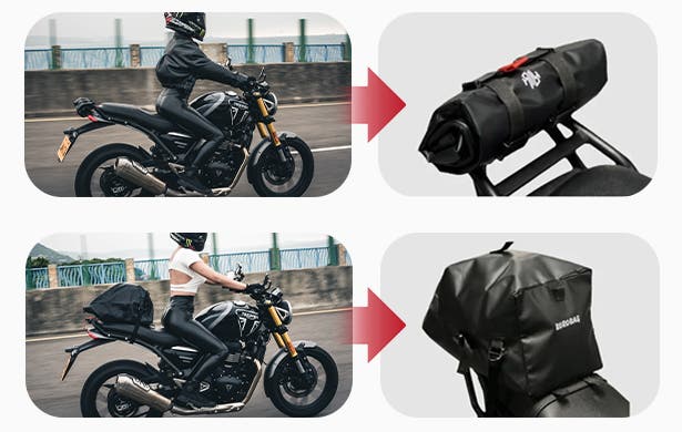 バイク用バッグが瞬時に両肩掛けバックパックに変身!