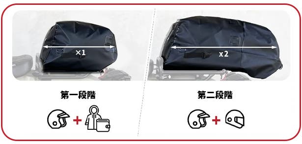第一段階の容量で収納できる荷物:手袋、雨具、3/4ヘルメット、個人用品