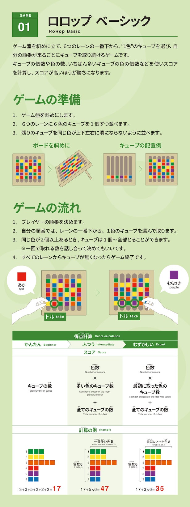 ・RoRop本体 × 1 (ゲームボード x1/ キューブx39 / ゲームシート x4 / ゲームブック x1 )