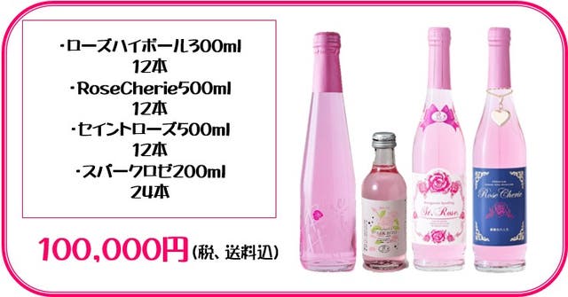 内容量:ローズハイボール 300ml×12本、ローズシェリエ 500ml×12本、セイントローズ 500ml×12本、スパークロゼ 200ml×24本