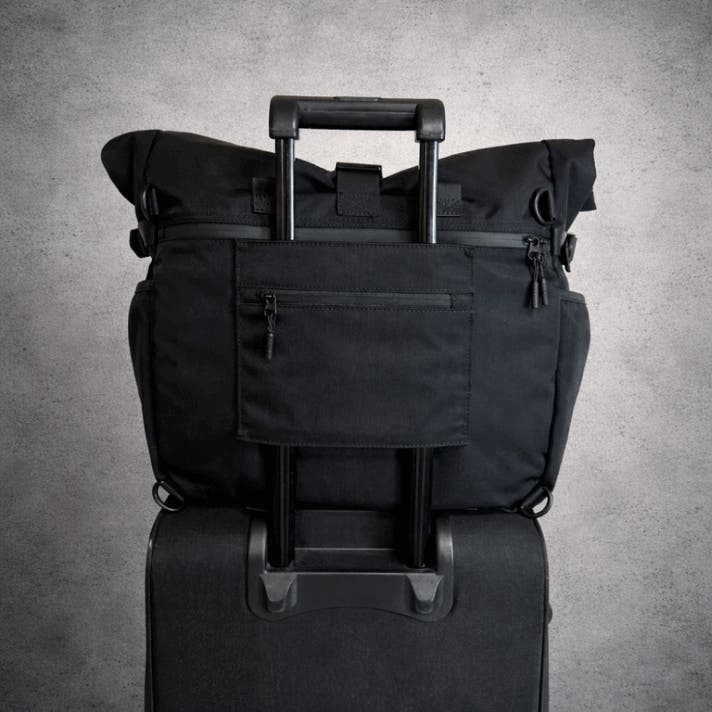 バッグの背胴には、キャリーバッグに取り付け可能なホルダーを付けました。ホルダーには、パスポートやキーホルダーが入るファスナーポケットも搭載しています。