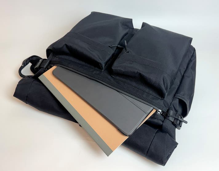 ガバッと開くこのファスナーポケットには、A4サイズのノートや書類、サッと取り出したいタブレットなどが収納できます。