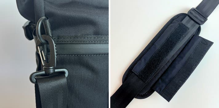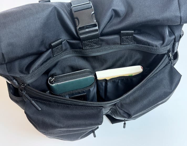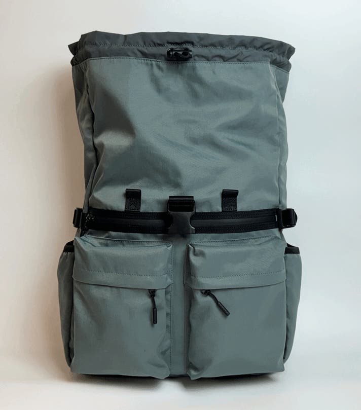 バッグ背胴には、こちらもYKK製止水ダブルファスナーを採用し、ロールトップを閉じた状態でも中身に直接アクセスできる仕様になっています。