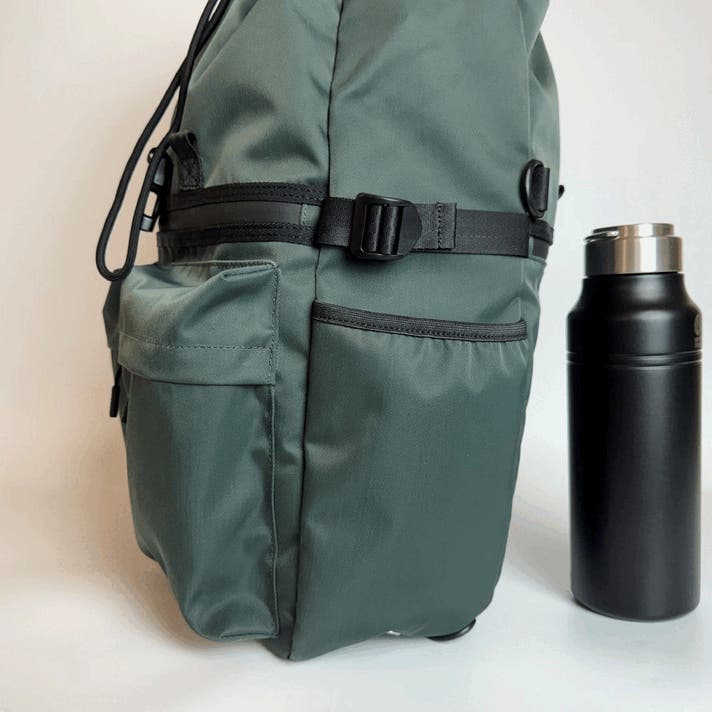 両サイドにあるボトルポケットは、最近ではご愛用も多い1000mlのマイボトルも入るサイズ感です。上記画像は、500ml、1000mlのボトル、折り畳み傘を入れてみました。