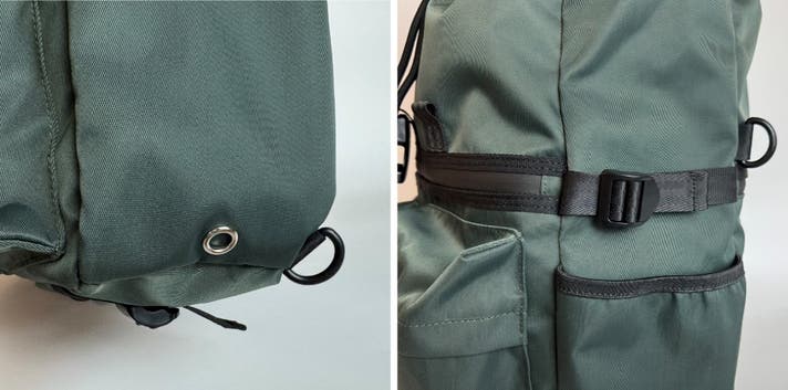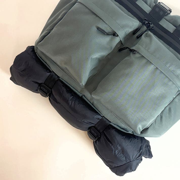 バッグ底部分に、アウターやギアを固定するストラップベルトを搭載しています。