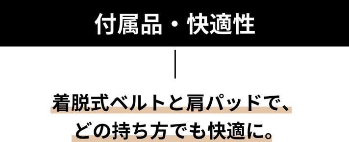 ショルダーベルトは、ねじれても着用したまま直せる回転式のパーツを使用しています。またベルトにセットできる斜め掛け用の着脱式の肩パットを標準装備しています。