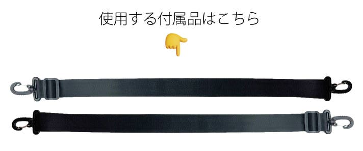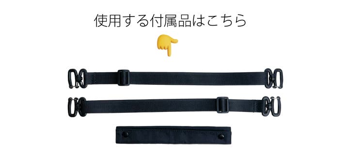 手持ち・トートとして使用する場合は、専用の付属ベルト2本を使用し、下記のようにバッグ前面と背胴とも2カ所にベルトを接続して使用します。