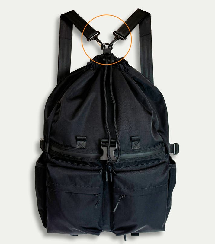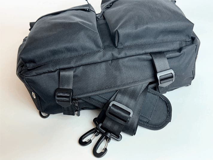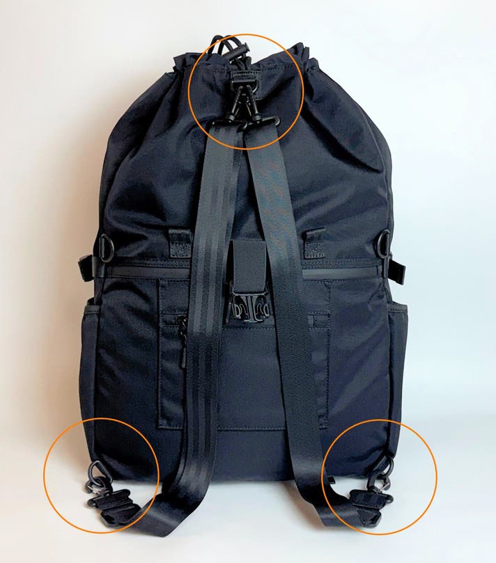 メッセンジャーの肩掛け用としても使用するショルダーベルトは2本付属されており、リュック使用時には、2本をバッグ背胴にある上部1箇所と下部2カ所のDカンに接続して使用します。