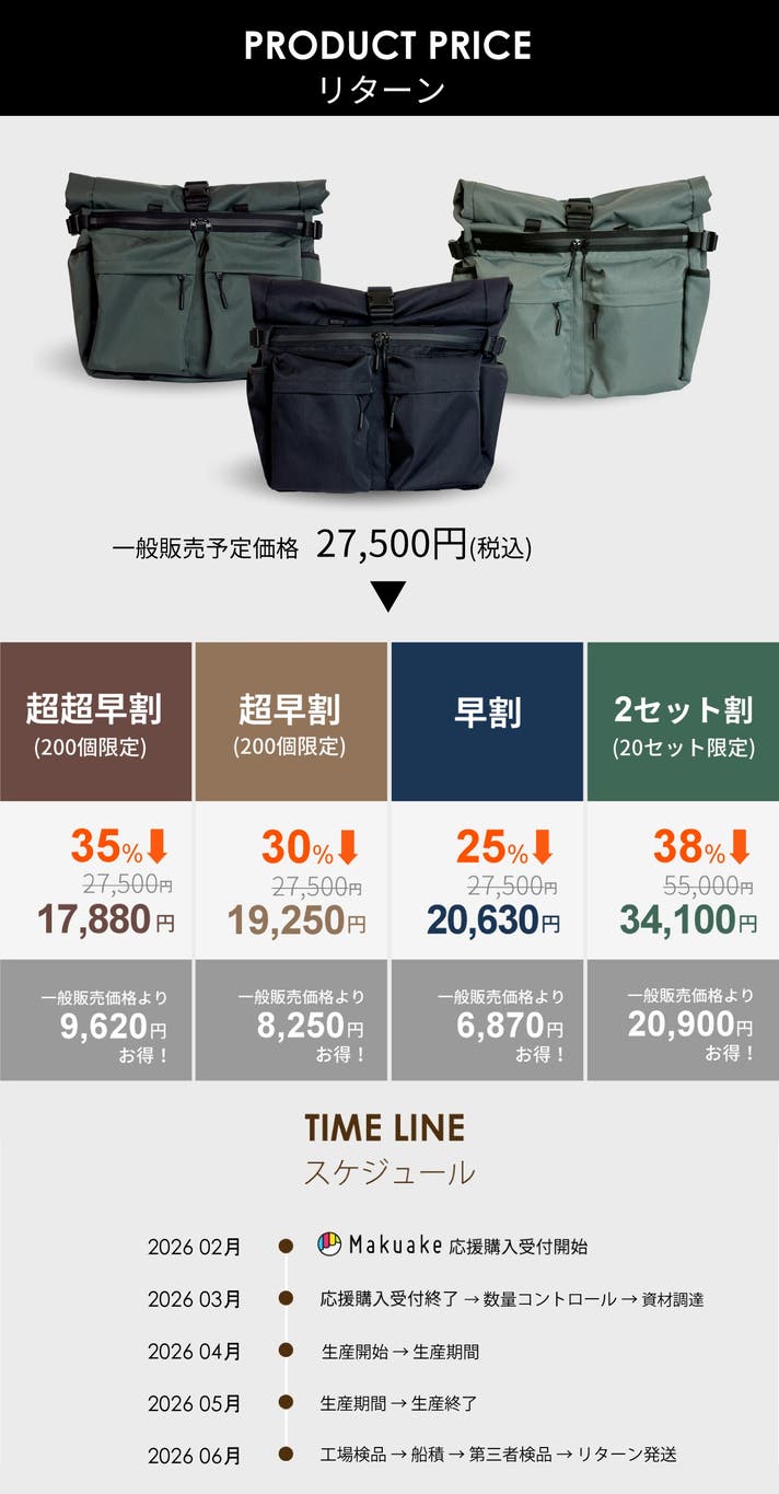 【商品の不具合による返品・交換について】 原則として、サポーター都合によるキャンセル・返金は承っておりません。 (サポーター都合のキャンセル不可の例:イメージ違い、誤注文、長期不在) ◾️対応条件: 商品の初期不良、またはお届けした商品がご注文内容と異なる場合、到着後7日以内にプロジェクトページの「実行者にメッセージ」よりご連絡ください。 状況を確認の上、返金対応、または良品との交換対応をさせていただきます。 ◾️返金額: リターン金額(税込)の全額 ◾️返品送料/再送料: 実行者負担 【返品・交換をお受けできない商品】 ・サポーターの責任により破損、汚損が生じた商品 ・商品のタグ、付属品、パッケージ(箱、袋など)を紛失、破棄された商品 ・事前にご連絡をいただいていない商品 ・商品到着後、8日以上経過した商品 【交換をお受けできないケース】 ・限定品や同一商品の在庫がない場合など、代替品をご用意できない商品 ・使用後のお客様都合による返品・返金はお受けいたしかねます。 ・量産過程で製品の細かな仕様が変更になる可能性があります。 ・お届け時期は予定です。生産事情により多少前後する可能性があります。 ・本文中に記載させていただいたスケジュールは、あくまでプロジェクト公開時点の予定です。応援購入の性質上、配送遅延のおそれがございます。 原則として、配送遅延に伴う応援購入のキャンセルはできませんが、リターン配送予定月から3ヵ月を超えた場合には、希望者に限りキャンセルにて対応させていただきます。 ・国内に類似商品が出回割る可能性がございます。弊社では他社類似品に関してのお問い合わせには対応できませんのでご了承下さい。 ・本プロジェクトを通して想定を上回る皆様から応援購入頂き、現在進めている環境から量産体制を更に整えることができた場合、正規販売価格が販売予定価格より下がる可能性もございます。 ※本プロジェクトはアンコールプロジェクト(*)の実施可能性があります。 (*)アンコールプロジェクトとは、実施したプロジェクトが好評だった場合において、当該プロジェクトが終了後に再び数週間から数ヶ月程度実施するプロジェクトを言います。 アンコールプロジェクト実施の場合、本プロジェクトとアンコールプロジェクトで同じ配送月を設定する可能性もございますが、本プロジェクトのサポーターを優先して配送いたします。