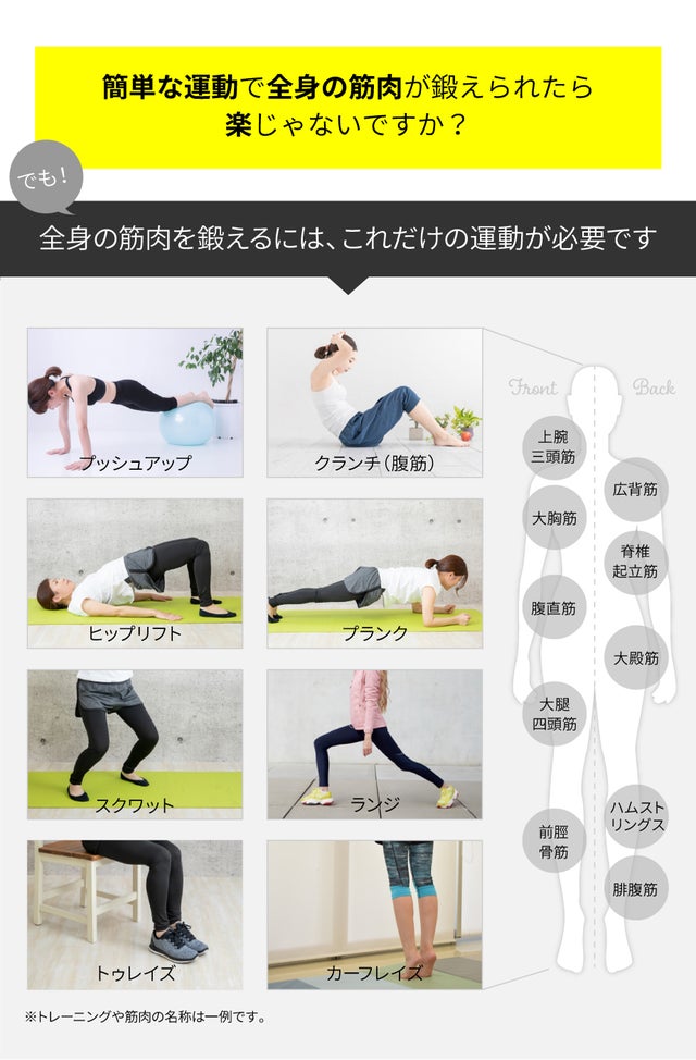 はじめにご説明したような、何種類もの筋トレをしなくて済みます。
