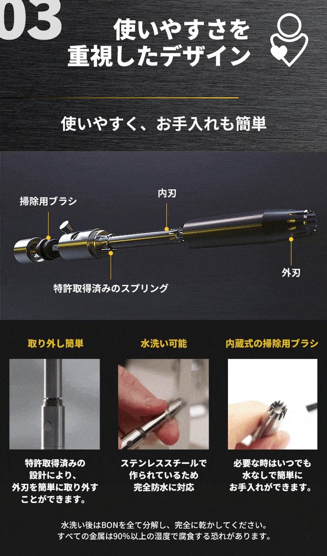 BONは以前のモデルからさらに改良され、様々な方向から鼻毛をカットします。