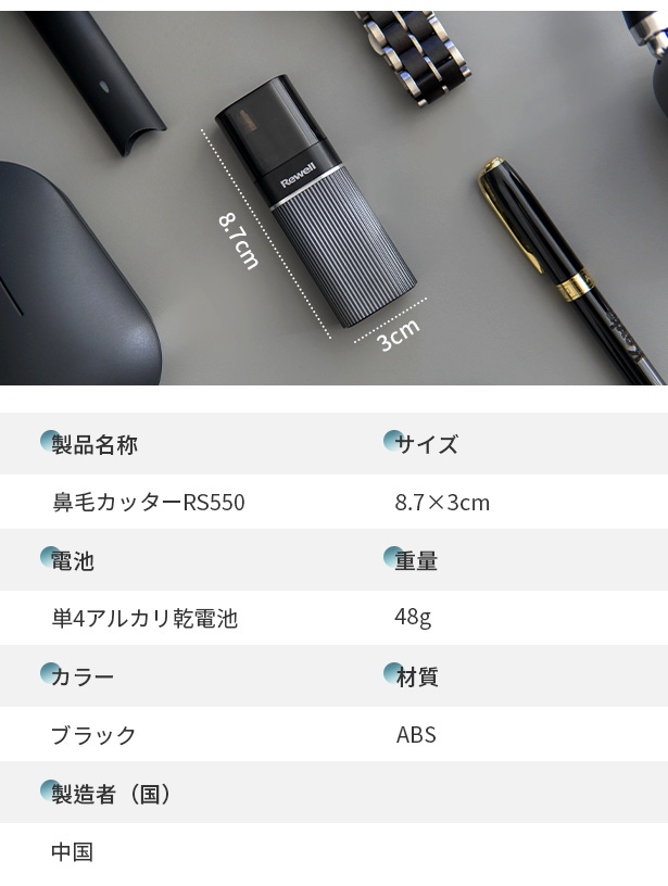 鼻毛を処理する道具はいろいろあり、ハサミやピンセット、または大きな動作がする電動カッターなどを使うことができます。鼻の中の皮膚を傷つけず、時間のない外出前に充電が終わるのを待つ必要がない鼻毛カッターがあったら…と考え、開発したのが「RS550」です。