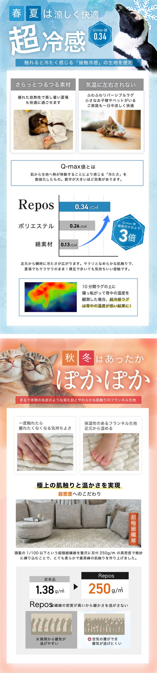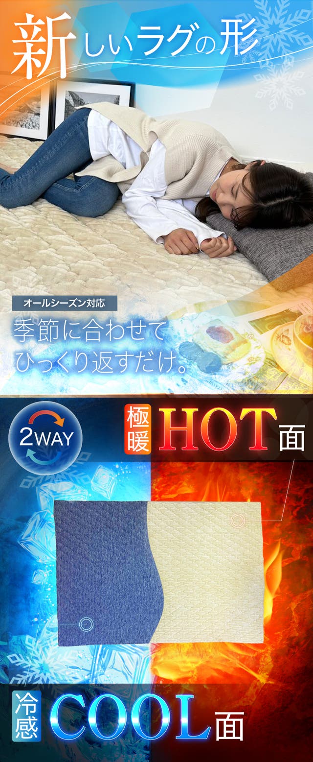 季節の移り変わりに合わせて、毎回ラグを変えるのは手間がかかりますよね。でも、このラグなら、一枚で1年中快適に過ごせます。冷感面と暖感面、2つの顔を持つこのラグは、まさに四季折々の心地よさを提供してくれるアイテムです。