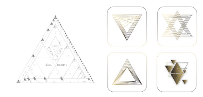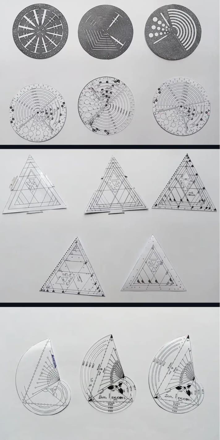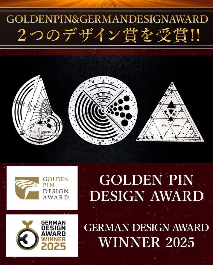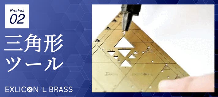 Exlicon L 黄金比ツールセット(真鍮)は、TGツール、三角ツール、円ツールを含み、これらは多機能で、黄金比に基づいた幾何学的な形状や角度を描くためにデザインされています。