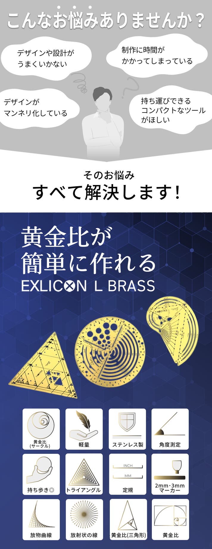 誰でも簡単に黄金比を描けて、それをデザインに活かすことができます。それだけでなく、さまざまな形状やアイデアの実現にも役立つこの Exlicon L Brass は、デザインや設計に悩む人の力強い味方になってくれると信じ、自信をもって紹介します!