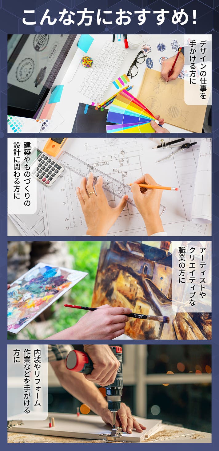 - デザイナー、建築家、DIYが趣味な方など、多分野で活用可能。初心者~プロまで使いやすいデザイン