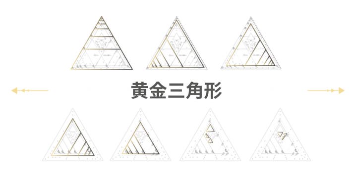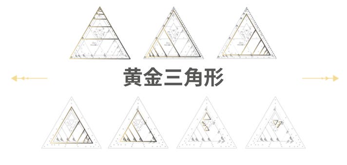 このツールには、7セットの黄金三角形が含まれています:前面には80mm、90mm、100mmから始まる3つのセット、背面には60mm、70mmから始まる2つのセットがあります。