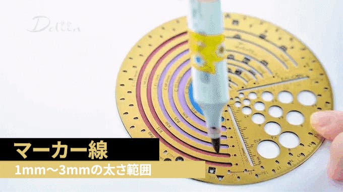 このツールは、マーカーペンで太線を描くアーティストやデザイナーに最適です。3mm幅の半円線(長さ8.56〜53.3mm)や、2mm幅(68.2〜112.9mm)、1.1mm幅の8つの線穴を備え、さまざまな表現に対応します。