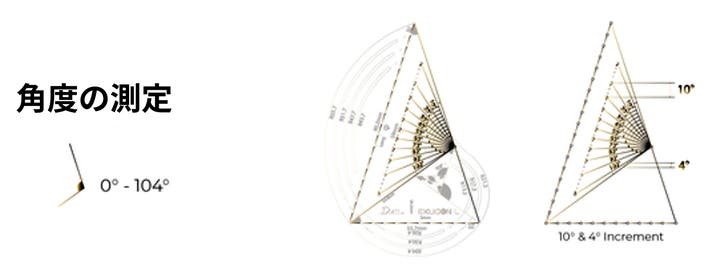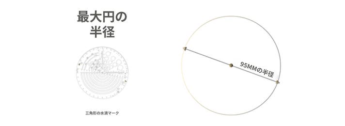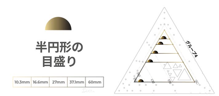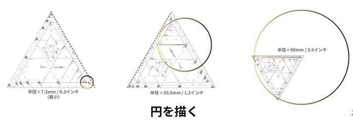 三角ツールの背面には、60mmサイズから始まる一連の黄金三角形を示す半円形マークの穴があります。