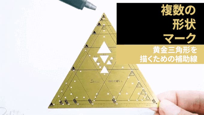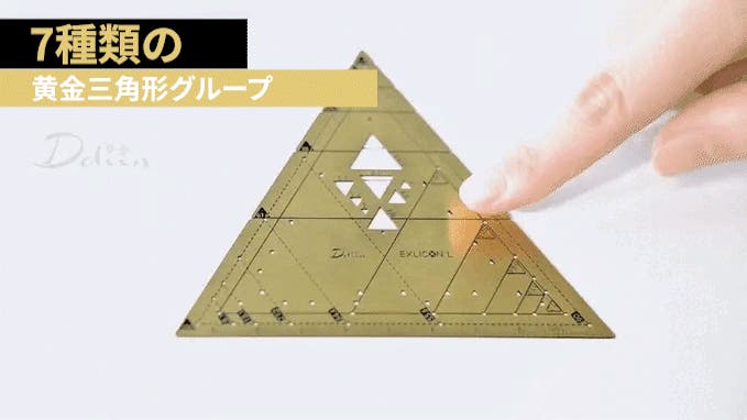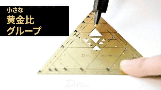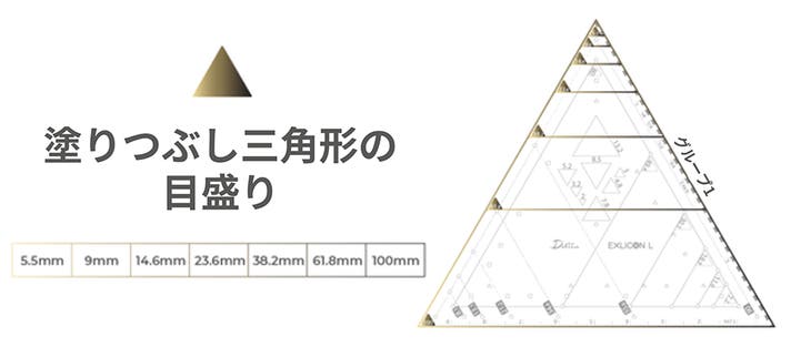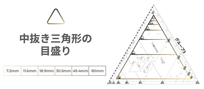 三角ツールの前面には、100mmサイズから始まる一連の黄金三角形を示す実線の三角形マークの穴があります。