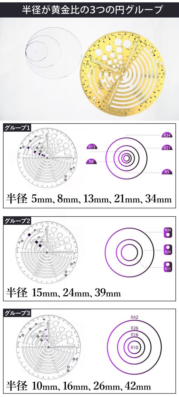 画像には、黄金比に基づいて整理された3種の円(半径5mm・10mm・15mm)と、8本のラインおよび識別マーク付きの穴が示されています。