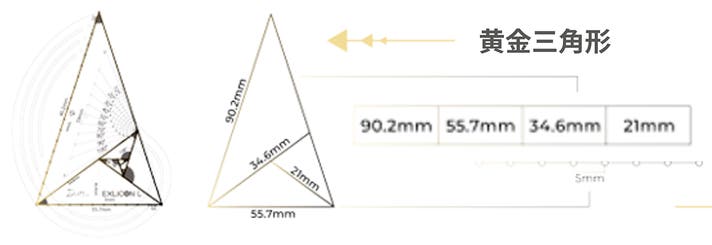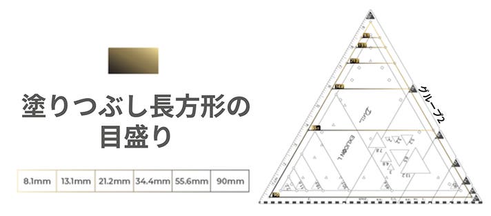 長方形のマークは、90mmから始まる黄金三角形セットを示します。