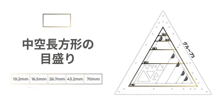 空洞長方形のマークは、70mmから始まる黄金三角形セットを示します。