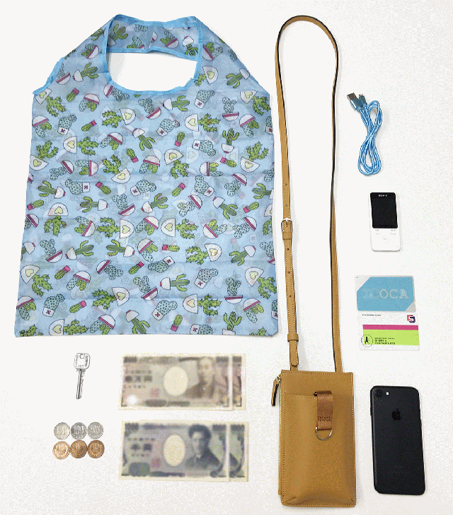 出かけるときにはスマートフォンとカード、少しの現金とエコバッグが入る小さなバッグが有ればOKです。