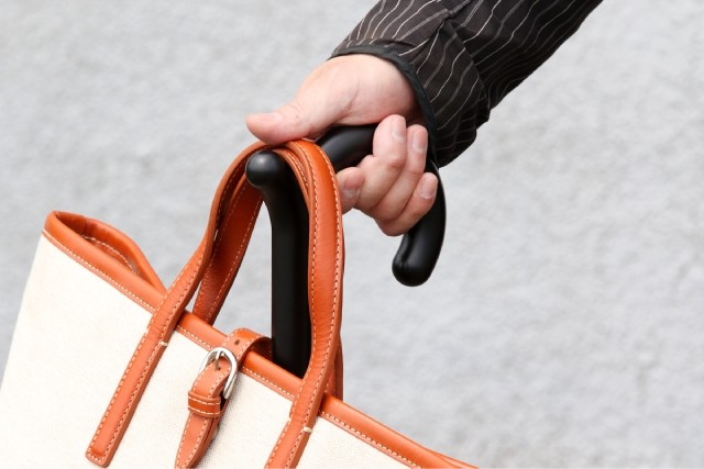 幅の広い持ち手や硬い持ち手のカバンなどはやはりフィット感が悪いですが、引っ掛けた上から手で押さえれば大丈夫。けっこう重い荷物もしっかり安定して保持できます。混雑する電車では迷惑がられるリュックも、傘にかけてしまえば比較的空間のある足元に持ってこれるので助かります。