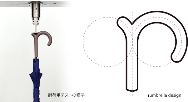 耐荷重はオフィシャルには5kgまでと表記させていただいていますが、公的試験場でのテストでは30kgの荷重を加えてもアルミのシャフトが曲がることはありませんでした。これはシャフトに垂直に力が加わるようにデザインされた「rumbrella」の特徴で、素材の持つ強度を最大限に引き出す工夫のひとつです。