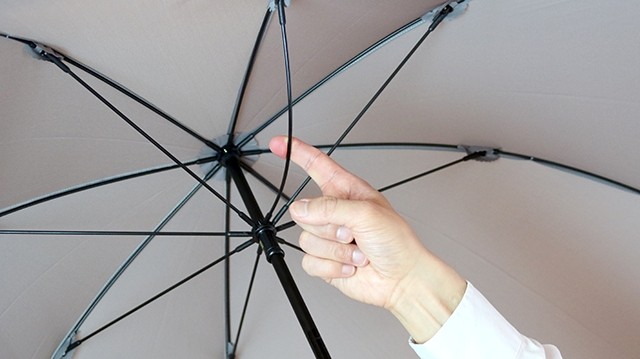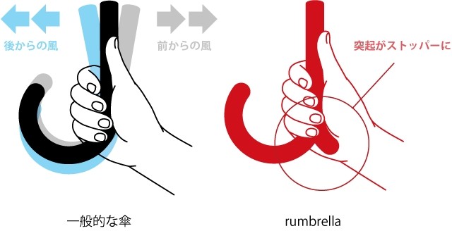 「rumbrella」の手元のカタチにはもうひとつ利点があります。それは手元の突起部分が手のひらの形状に自然にフィットして、強い風や雨の時も傘をしっかりホールドできること。親指の付け根の膨らんだ部分に「rumbrella」の持ち手のカーブが沿うように造られていて、傘が振り回されそうなゲリラ豪雨でも、手の中でがっちり傘を支えることができます。