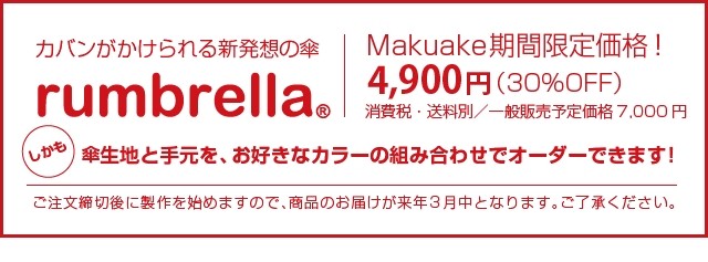 Makuakeのこのプロジェクトを通じて、2017ニューモデルの「rumbrella」を実現するチャンスをいただきつつ、先取の気概あふれるサポーターの皆さまと一緒に「都市型傘」という新しいスタンダードを創り上げていく一歩にしたいと願っています。