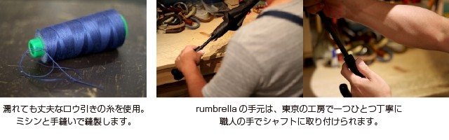 「rumbrella」は、そのユニークな手元のデザインはもちろん、 日本製の傘生地、縫製の糸にも気を配り、 軽くて頑丈な「傘」としての仕立てにこだわりました。 親骨に使用しているグラスファイバーのしなやかさは多少強引に引っ張ってもビクともしません。