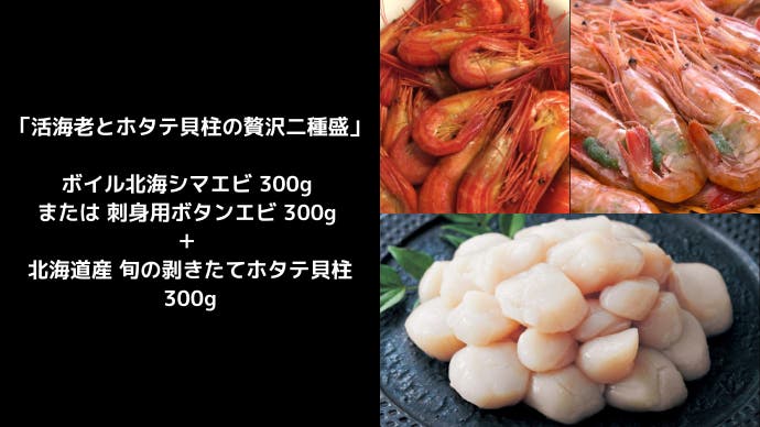 ボイル北海シマエビ 300g または 刺身用ボタンエビ 300g + 北海道産 旬の剥きたてホタテ貝柱 300g